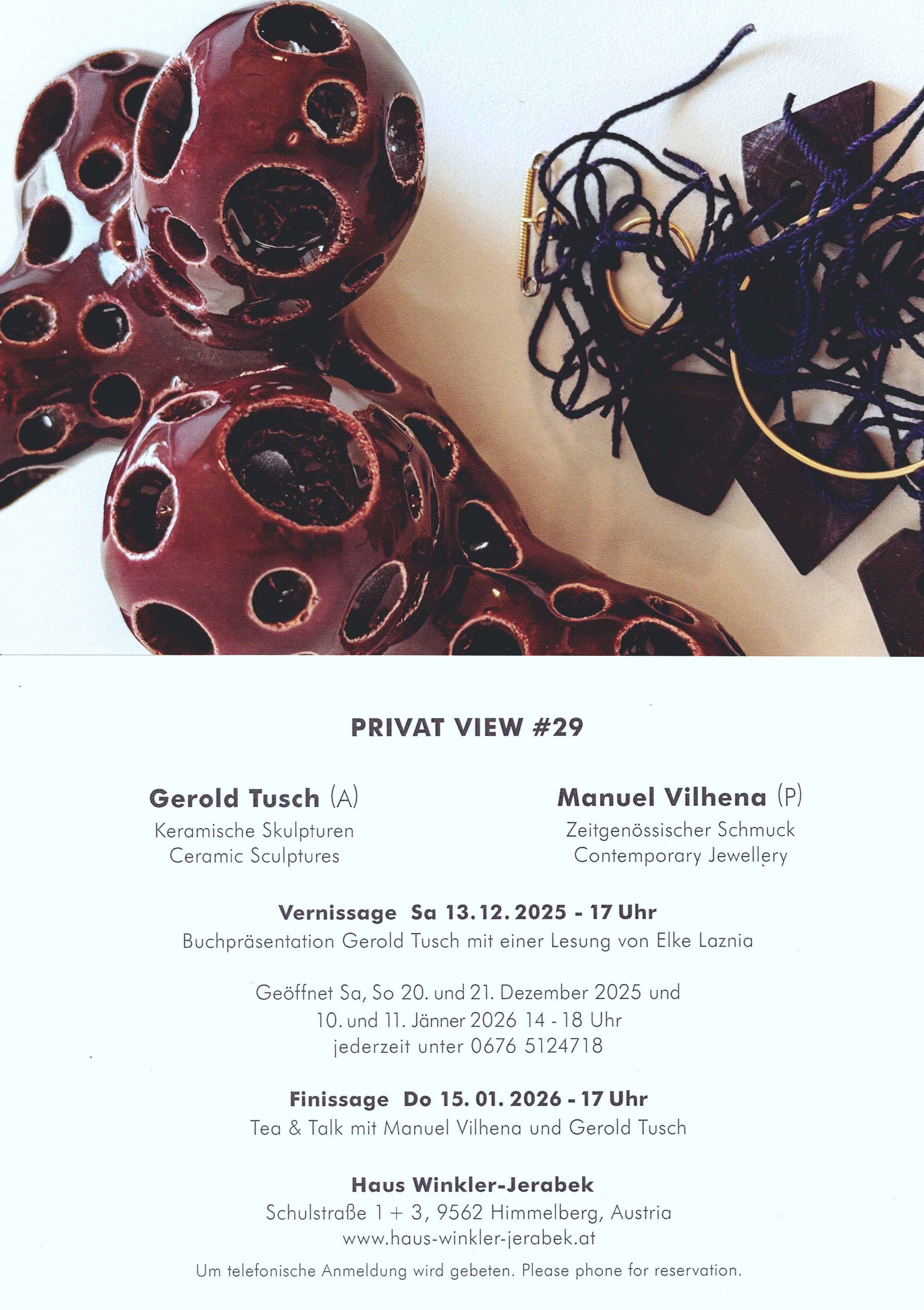 In der Ausstellung trift meine Arbeit auf zeitgenössischen Schmuck von Manuel Vilhena - geistreich, witzig und vereinnahmend. Vernissage mit Lesung am 13.12.2025 um 17 Uhr - und zur Finissage am 15.1.2026 wieder um 17 Uhr Tea & Talk mit Manuel und mir. Ich freue mich über alle, die den Weg nach Himmelberg in Kärnten finden!